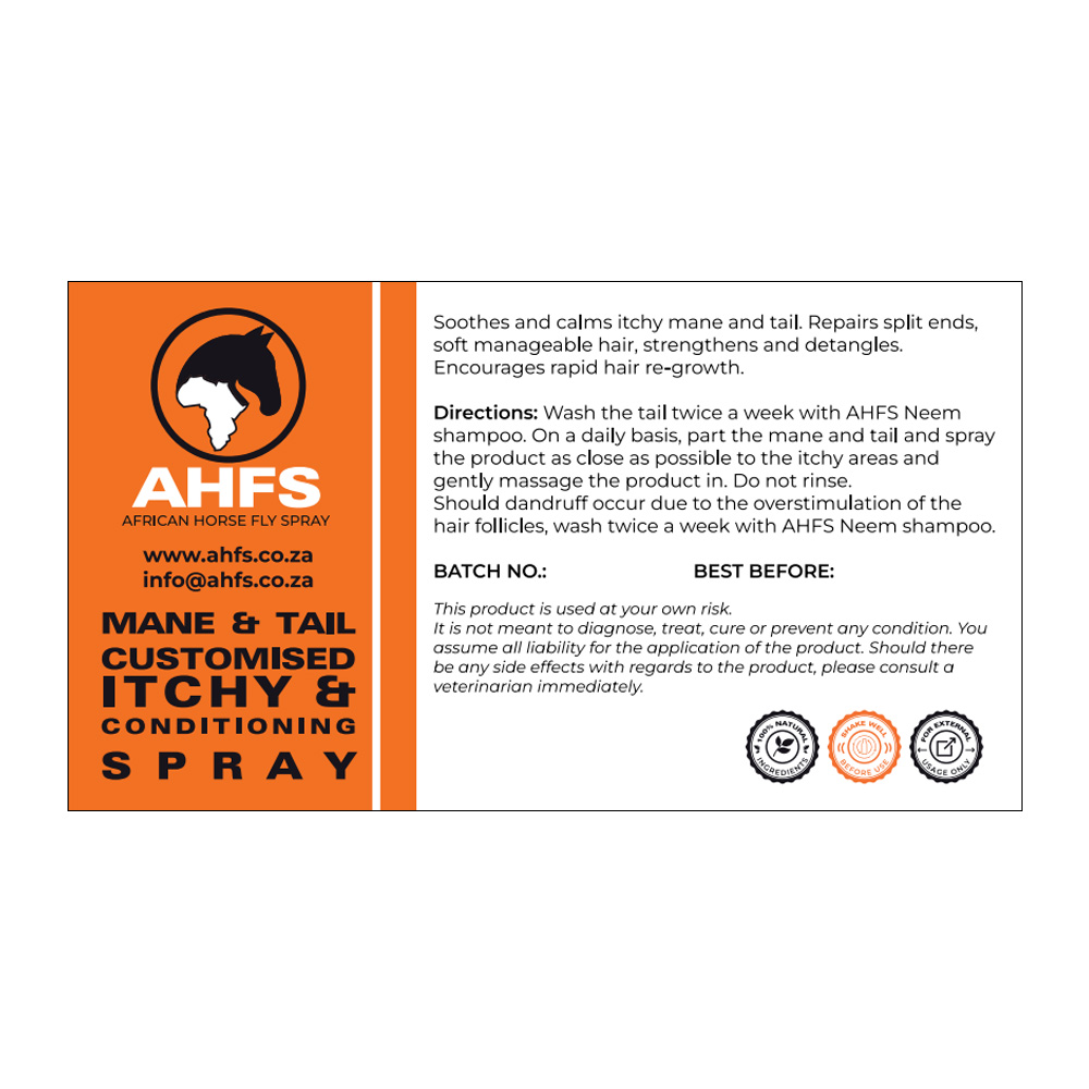 Wash tail twice a week with AHFS Neem shampoo. On a daily basis, part the mane and tail and spray the product as close as possible to the itchy areas and gently massage the product in. Do not rinse.
