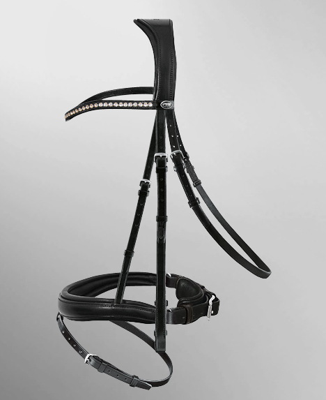 This flat-lying snaffle bridle with stud hooks features a curved browband with large, sparkling strass crystals. Setting a new standard in terms of horse-friendliness, this bridle has a new, softly-padded, anatomically-formed head piece, contoured around the horse’s ears, which effectively relieves pressure. In addition, the bridle comes standard with a softly-padded, anatomically-formed Caveson Special with flash noseband, especially well-suited to horses with sensitive mouths.
