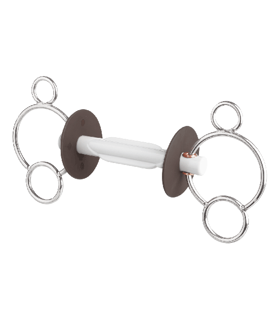 The butterfly bar is an absolute innovation in the field of mouthpieces. The anatomically correct shape combined with a broader surface in the tongue area creates the optimum amount of room for this sensitive muscle with the possibility of a very gentle effect. Horses show they are feeling at ease by increased chewing and more acceptance of the bit. If a stronger effect on the horse‘s mouth is needed, the angulation of the bit in the mouth can be altered with a sidepiece that acts as a lever. The increased pressure on specific points can achieve the communication desired. When the pressure is reduced, the butterfly mouthpiece goes back to the comfortable position.The loose ring means a greater mobility of the bit in the mouth. The snaffle is therefore a bit for horses who prefer a “more mobile” bit in their mouth. The ring runs very evenly in its copper sockets and the better durability increases the lifespan of the bit substantially.