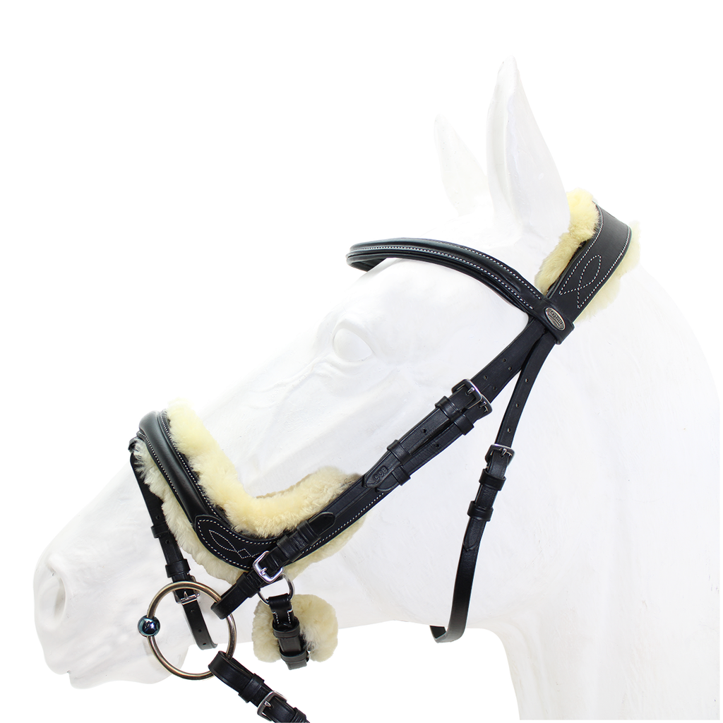 The headband, also lined with soft sheepskin, ensures a comfortable fit that minimizes pressure, allowing your horse to perform at its best. The regular pullback strap is padded with sheepskin underneath for additional comfort and security. The bridle features detailed stitching on the noseband and headpiece, adding a touch of elegance to its practical design.