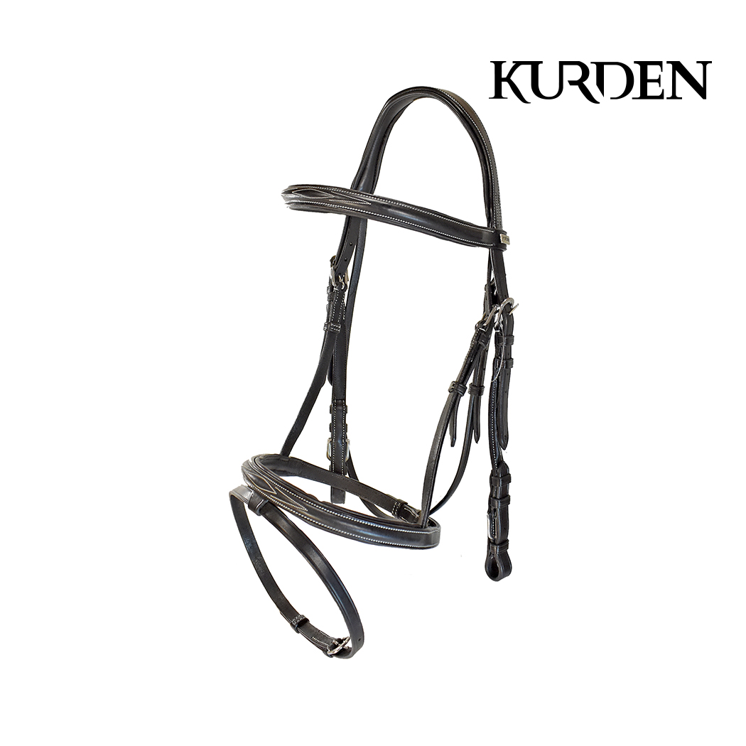 Kurden Fancy Stitch Snaffle Bridle with padded anatomic head piece and padded noseband. Stainless steel fittings and stylish white stitching rounds off this striking American leather bridle.